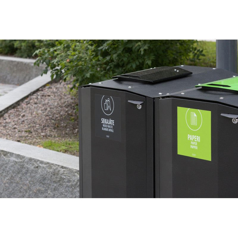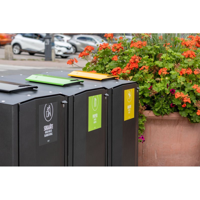 EkoCity-lajitteluastia on myös kätevästi yhdisteltävissä; sitä voidaan käyttää joko yksittäin tai osana suurempaa lajittelupistettä. Sen selkeät värit ja lisävarusteena saatavat lajittelutarrat kannustavat jätteiden lajitteluun.