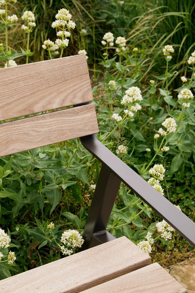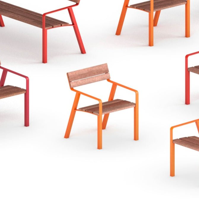 Runko on valmistettu sinkitystä ja pulverimaalatusta teräksestä, joka kestää sääolosuhteita ja julkisen käytön kulutusta. Istuinosan ja selkänojan FSC®-sertifioidusta jatoba-kovapuusta valmistetut säleet tuovat luonnollisuutta ja viimeistellyn ilmeen. Kiinteä asennus tekee tuolista vakaan ja turvallisen valinnan esimerkiksi katualueille, aukioille tai puistokäytäville.