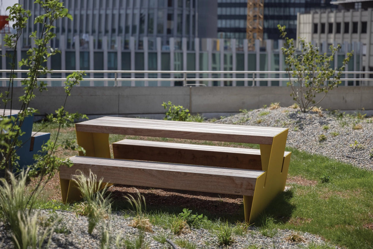 Blocq-pöytäpenkki on suunniteltu kestämään kovaa käyttöä ja vaihtelevia sääolosuhteita. Piknik setin selkeä ja kulmikas muoto tuo ryhtiä ympäristöönsä, ja pinta-asennettava rakenne takaa vakaan kiinnityksen koville alustoille.