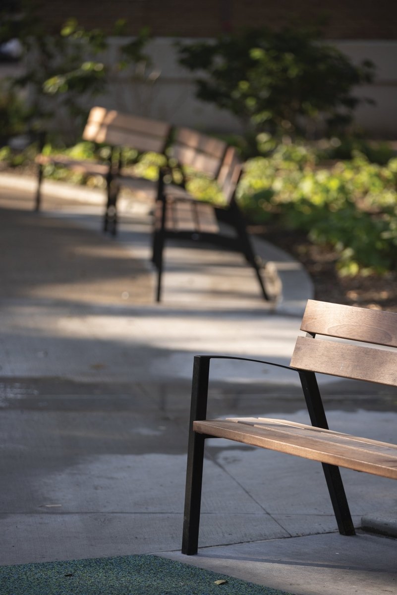 Selkeälinjainen puupenkki kaupunkimaisemaan