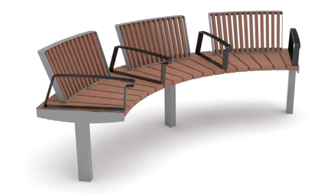 Vera Solo LVS635-a-t on mukava ja muuntautumiskykyinen penkki kaupunkiympäristöihin. Vera Solo -mallisto koostuu suorista ja kaarevista penkkimoduuleista, joista voidaan muodostaa pidempiä luovia istuinkokonaisuuksia esimerkiksi puistoihin tai toreille. Tämä penkkimoduuli on kaartuva ja selkänojallinen, ja sen jokaista istumapaikkaa ympäröivät käsinojat.
