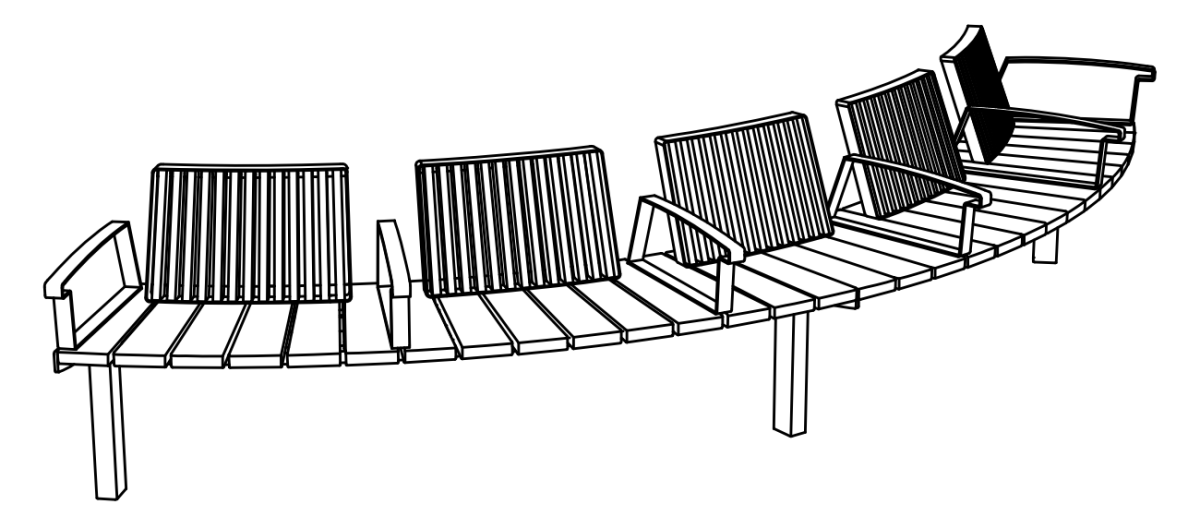 Vera Solo LVS675-e-t on mukava ja mukautuva penkki kaupunkitilaan. Vera Solo -malliston suorista ja kaarevista penkkimoduuleista voidaan muodostaa pidempiä omaperäisiä istuinkokonaisuuksia esimerkiksi puistoihin tai toreille. Tämä penkkimoduuli on kaartuva ja selkänojallinen, ja sen jokaista istumapaikkaa ympäröivät käsinojat.