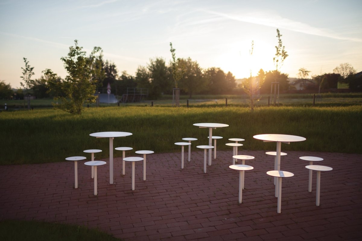 Kapea ja kestävä: Halkaisijaltaan vain 300 mm, jauhemaalattu teräsrunko ja istuinosa ulkokäyttöön soveltuvasta HPL-materiaalista. Saatavilla mmcitén vakioväreissä.